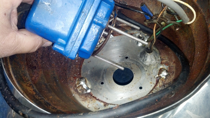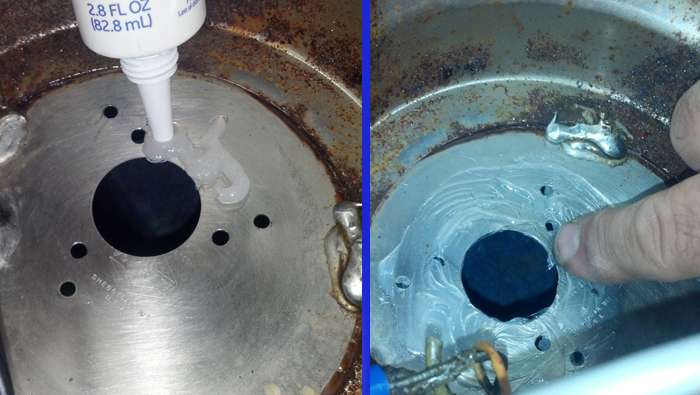 Apply clear silicone to the face of the pump motor. Spread it to coat the entire metal surface. Try to keep it off the center rubber seal.