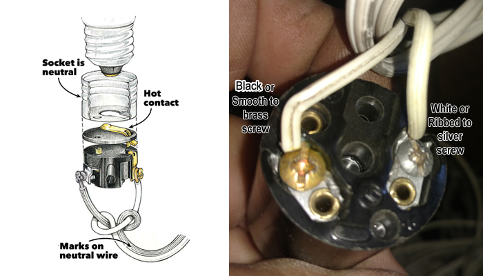 It is important that the white or neutral wire is attached to the correct side of the socket. If both wire to the socket are white be sure the ribbed wire is attached to the outer socket. Sockets have 2 screws and one is usually silver or natural color, this is the neutral or white side. The other socket screw is usually brass color and this is the HOT or black side. THIS IS IMPORTANT. If you have the wires reversed you can get shocked from touching the outer socket of the bulb while unscrewing it. |